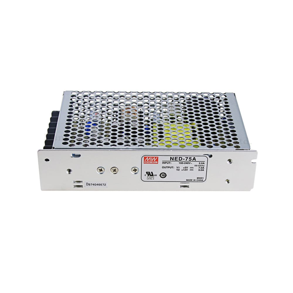 The MEAN WELL NED-75A is a high-efficiency, industrial-grade dual output power supply designed for reliable performance in automation and control systems. This unit provides a stable dual DC output of 5V and 12V, making it an ideal choice for complex electronics requiring multiple voltage rails.