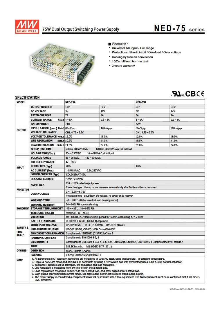 MEAN WELL NED-75A | 5V 12V 71W Dual Output Power Supply